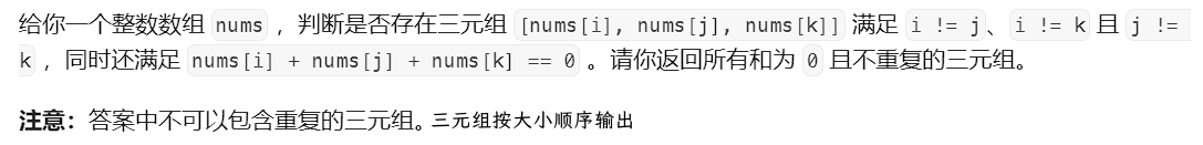 \begin{algorithm} \caption{threeSum(nums)} \begin{algorithmic} \State List[List[int]] result \If{nums.length<3} \State \Return result\Comment{当数组长度不足3时不可能有满足情况的组合} \EndIf \State sort(nums)\Comment{对nums进行排序} \State target=0\Comment{可进行扩展} \For{i=0\To nums.length-2}\Comment{保证有i,j,k的空间} \State j = i + 1 \State k = nums.length - 1 \If{i>0 \And nums[i]==nums[i-1]} \Continue \EndIf \While{j<k}\Comment{遍历i某值下的所有情况} \If{nums[i]+nums[j]+nums[k]<target} \State j = j + 1 \While{nums[j]==nums[j-1]\And j<k} \State j = j + 1 \EndWhile \Elif{nums[i]+nums[j]+nums[k]<target} \State k = k -1 \While{nums[k]==nums[k+1]\And j<k} \State k = k - 1 \EndWhile \Else \State nums.append([nums[i],nums[j],nums[k]]) \State j = j + 1 \State k = k - 1 \While{nums[j]==nums[j-1]\And nums[k]==nums[k+1]\And j<k} \State j = j + 1\Comment{j,k不一起蹦的原因,当更新后落入这个while循环假,设j,k之间仅有一个元素,且这个元素对于j而言是新值,一旦二者同时变动j,k将会同时指向相同的元素而跳出循环,造成缺少含有这个的组合(1,11,15)[(10,11,15)j=10,k=15,i=1]} \EndWhile \EndIf \EndWhile \EndFor \Return result \end{algorithmic} \end{algorithm}